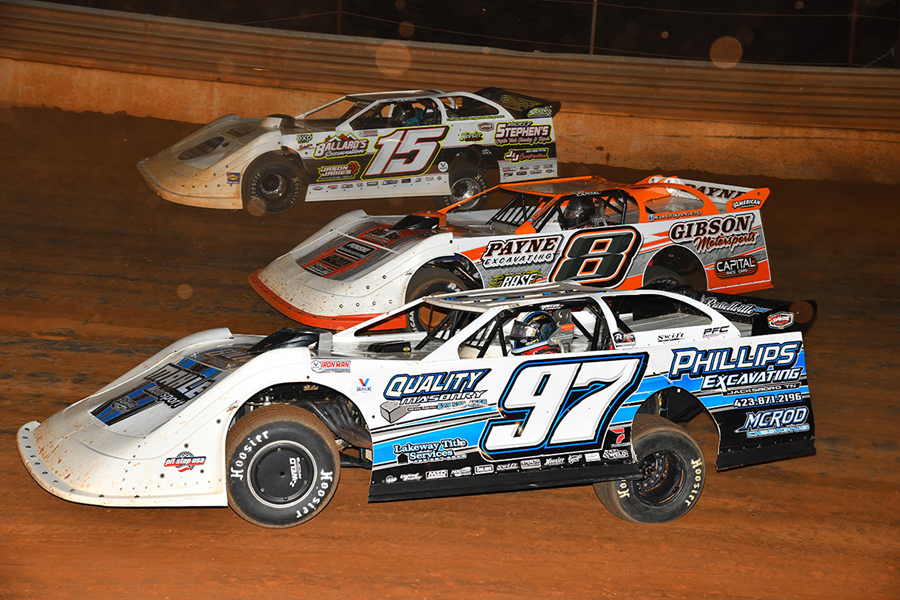 Christian Hanger goes three-wide during the 'Lil Bill Corum Memorial' at Tazewell (TN) Speedway -